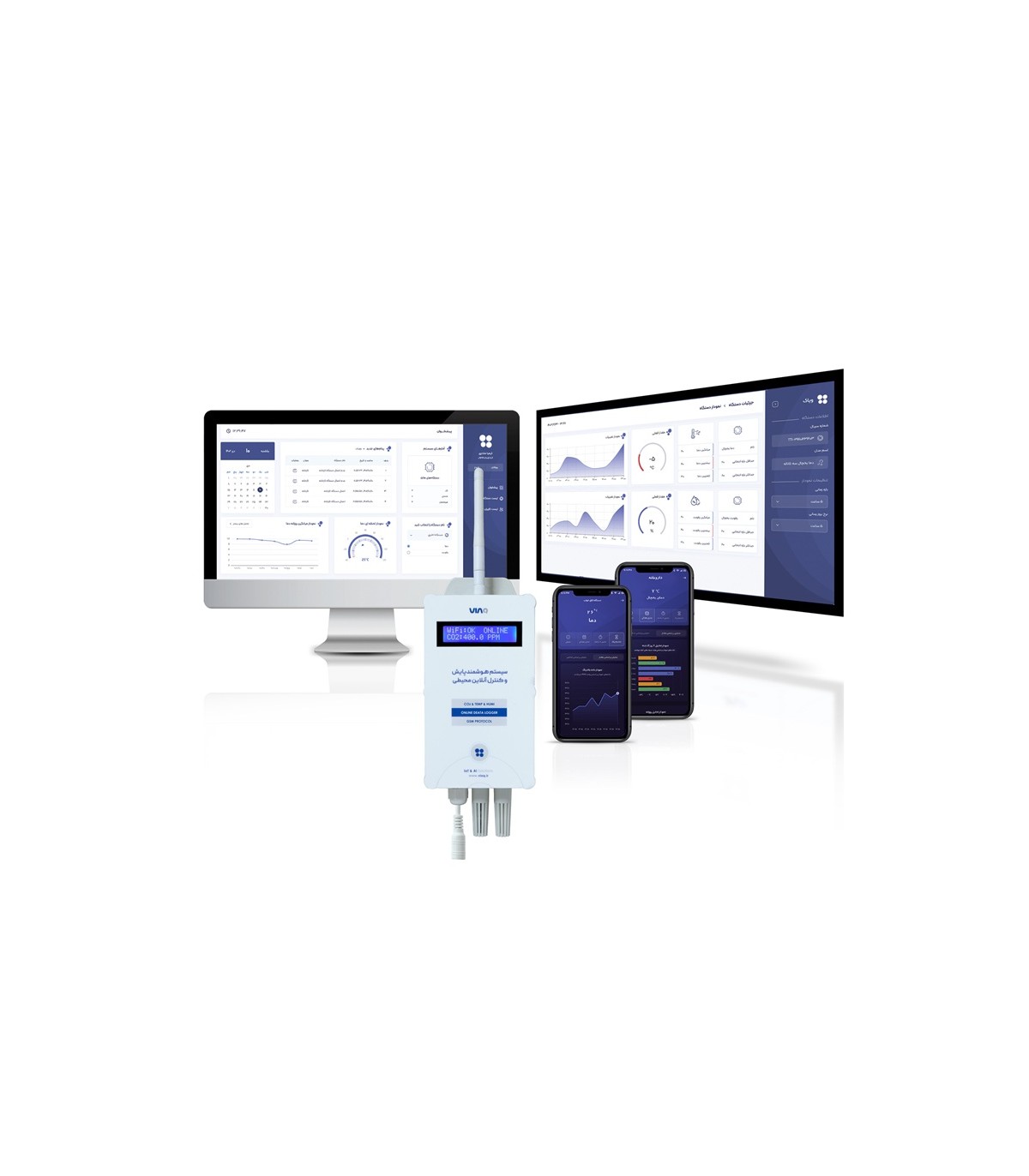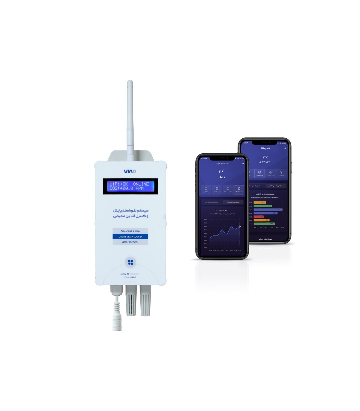 این دیتالاگر دارای یک حسگر دی اکسید کربن از نوع مادن قرمز غیر پراکنده (NDIR) با دقت، پایداری و طول عمر بالا و همچنین یک حسگر دقیق دما و رطوبت محیط می باشد که برای استفاده در صنایع گلخانه ای، پرورش قارچ و سالن های مرغداری بسیار کاربرد دارد. این دیتالاگر از طریق یک عدد سیم کارت به اینترنت متصل می شود و داده های مربوط حسگرها را از طریق اینترنت به اپلیکیشن تلفن همراه ویاک ارسال می کند.